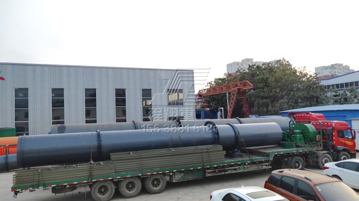 第一車與第二車裝載的是烘干、冷卻機,滾筒烘干機的直徑為1.5米,長度15米,回轉(zhuǎn)式冷卻機的型號小一號,直徑為1.4米,長度為14米。