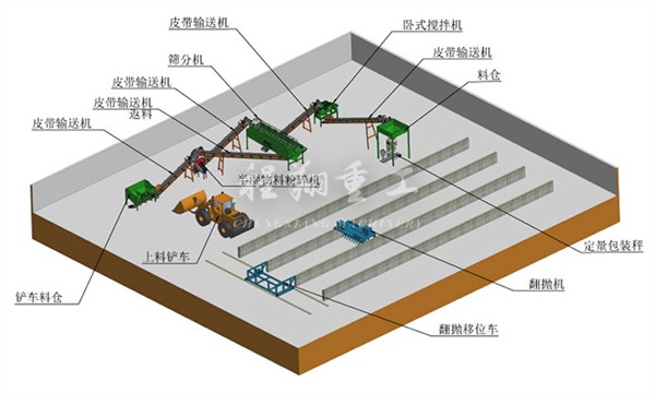 本次牛糞全套有機(jī)肥料設(shè)備生產(chǎn)工藝采用槽式好氧發(fā)酵,利用翻堆槽發(fā)酵既干凈又能最大化的利用有限的場地,增加糞便處理量。由于客戶對于顆粒有機(jī)質(zhì)含量以及NPK有特殊要求,因此我們?yōu)榭蛻魧iT定制了一臺三倉的靜態(tài)配料系統(tǒng)。
