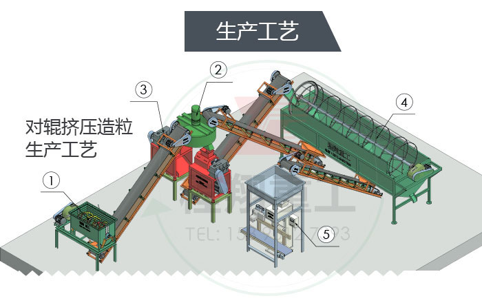 ① 臥式攪拌機 ② 盤式喂料機 ③ 對輥擠壓造粒機 ④ 滾筒篩分機 ⑤ 自動包裝秤