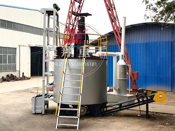 將待發(fā)酵的物料投放到進料提升斗內,通過電動提升裝置將物料送進發(fā)酵罐中,在投放物料的同時,啟動主電機,通過電機減速機帶動主軸開始攪拌。同時攪拌軸上所帶的螺旋葉片帶動物料翻轉,使物料與空氣充分接觸,在攪拌的同時,通過高壓羅茨風機不斷打入空氣,在發(fā)酵罐底部上端設計有曝氣管道,對通過的氣體進行加熱,使待發(fā)酵物料開始進行有氧發(fā)酵階段。在加熱的同時通過溫度傳感器對罐體的溫度進行調控,將發(fā)酵罐的溫度控制在發(fā)酵所需的最佳狀態(tài)。在物料發(fā)酵完畢后,通過出料口排出罐體,進行下一步加工處理。