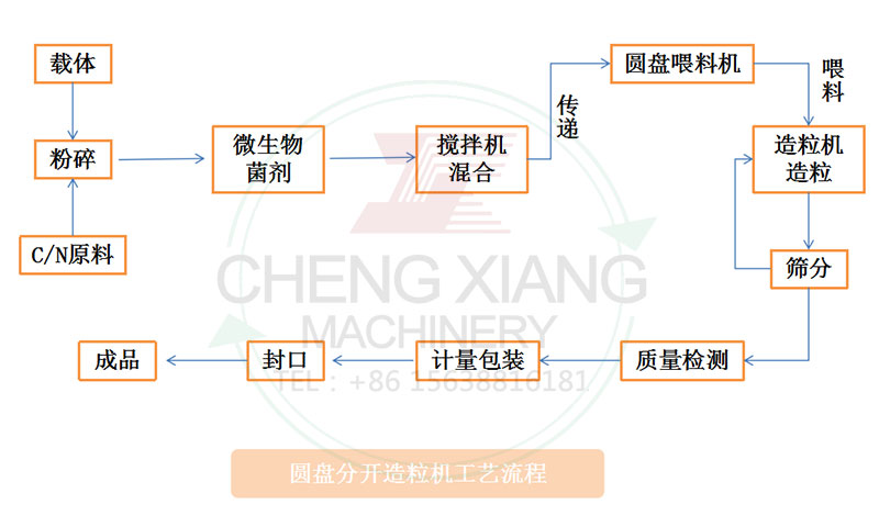 微生物肥料生產工藝的關鍵是造粒方式的選擇,目前微生物肥料常用的造粒方式主要有兩種(圓盤造粒和擠壓造粒),因不同的造粒方式對原料的要求不同,故生產工藝也會不同。程翔重工通過對四種生產工藝(圓盤混合造粒、混合后擠壓造粒、擠壓造粒后噴加菌劑、分開造粒)的比較研究得知,微生物肥料生產工藝以選擇圓盤分開造粒工藝為佳。因為該工藝可以減少化肥對微生物菌劑的影響,先將載體與菌劑造粒后,存放至中間料倉,再與載體和無機肥造粒后的粒子混合,最后得產品。