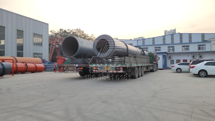 第一車與第二車裝載的是烘干、冷卻機,滾筒烘干機的直徑為1.5米,長度15米,回轉(zhuǎn)式冷卻機的型號小一號,直徑為1.4米,長度為14米。